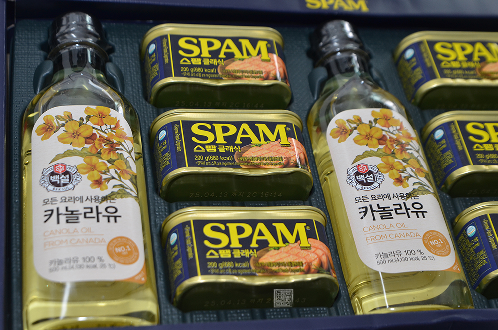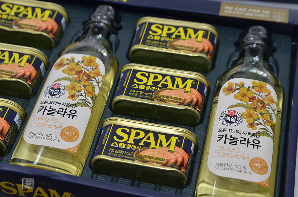 위 사진에서 볼 수 있는 스팸 복합 2호 선물 세트 구성을 본다면 아이들과 20~30대 세대들이 좋아하는 스팸 클래식 200g 6개와 함께 식용유 카놀라유 500ml 제품 3개가 들어가 있다. 스팸만으로 가득 채워져 있을 경우 가격이 상당히 비싸지기 때문에 스팸과 식용유 카놀라유가 적절히 섞어 있는 제품이 최근 인기 리에 팔리고 있다고 한다.