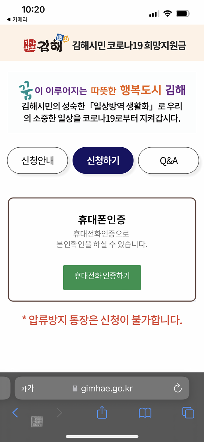 먼저 스마트폰으로 김해시 희망지원금 10만 원 지급 신청을 하기 위해서는 온라인 신청 페이지(링크)에 접속을 먼저 해야 한다. 홈페이지 주소를 직접 입력해서 신청하는 방법도 있지만, 나는 공식 홈페이지에서 다운을 받아둔 공지사항 이미지에 첨부되어 있는 QR코드를 확대해서 스마트폰의 카메라로 QR 코드를 찍어서 신청 페이지에 접속했다.