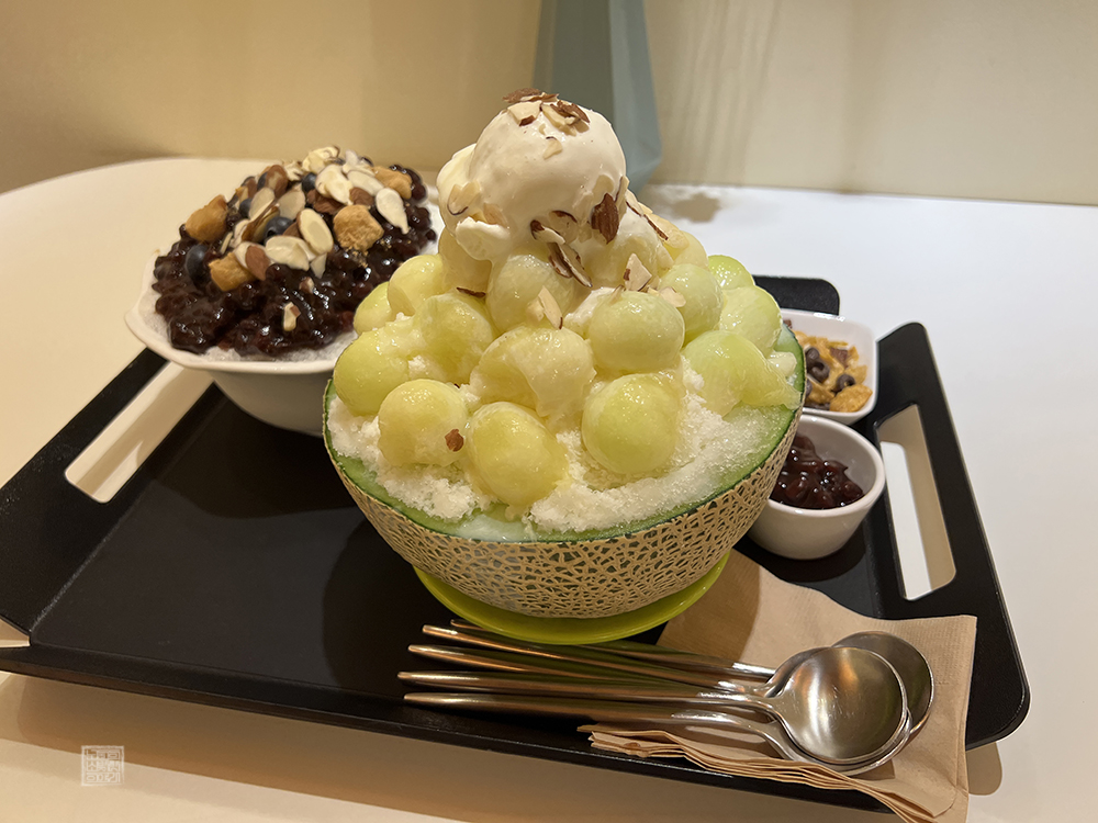 당일 우리가 주문한 건 일반 팥빙수 한 개와 동네한바퀴의 얼굴로 불리는 메론 빙수다. 총 다섯 명이 카페를 찾았다 보니 처음에는 빙수를 세 개 정도 주문할 생각이었지만, 간단히 저녁을 먹은 이후에 카페를 찾은 터라 두 개 정도면 충분하지 않을까 싶어서 팥빙수 한 개와 메론 빙수를 주문했다. 빙수의 양이 적지 않아서 딱 알맞은 선택이었다.