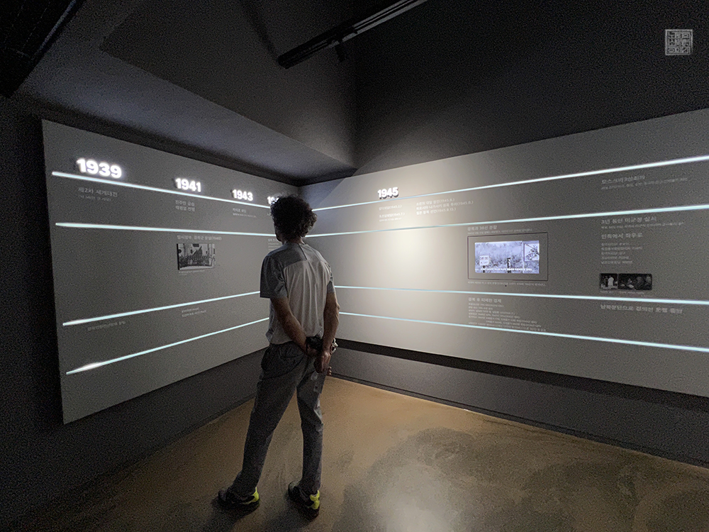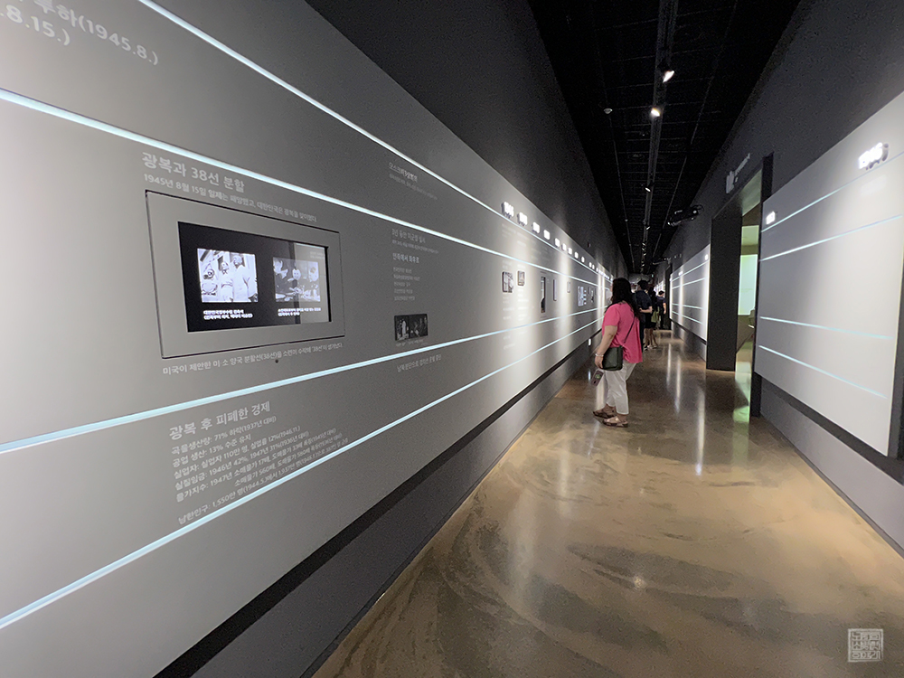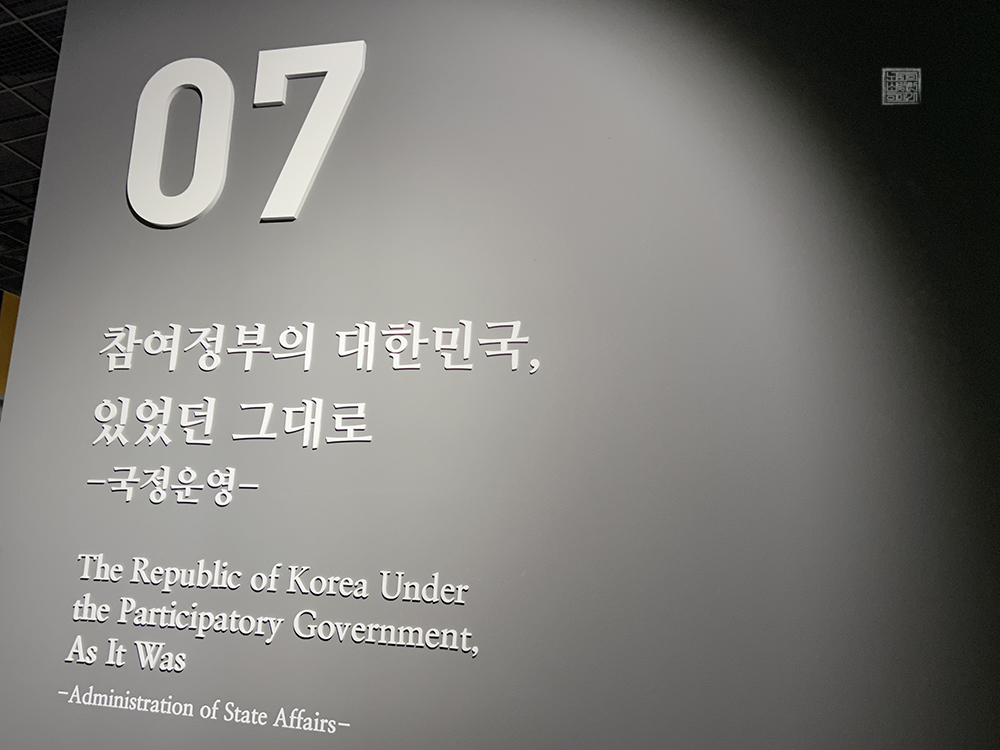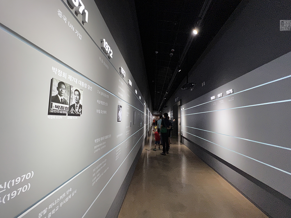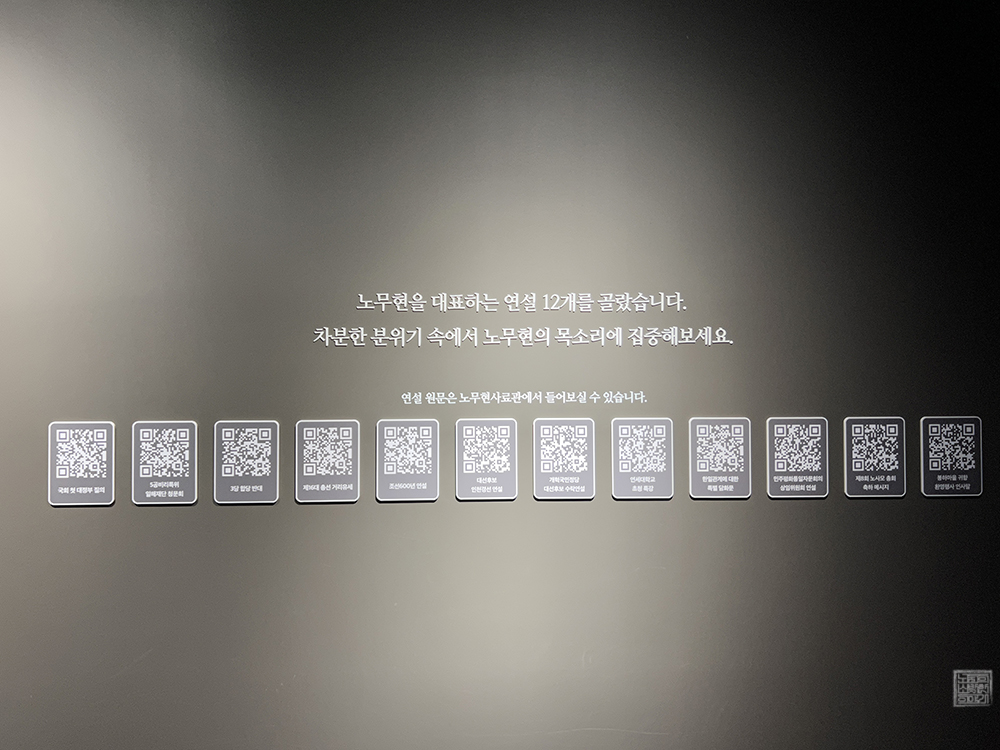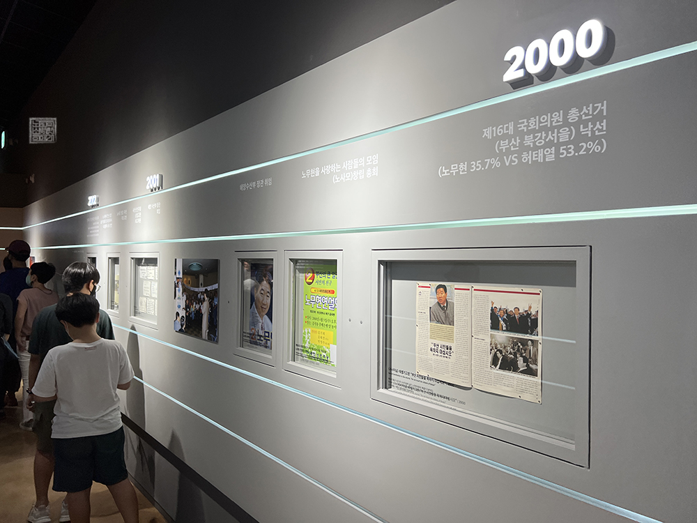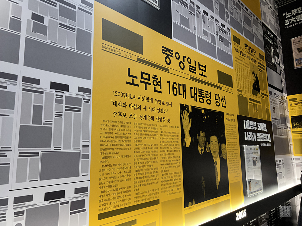 왼쪽 벽면에서는 연도에 따른 중요한 역사적 사건들이 정리되어 있고, 오른쪽 벽면에서는 고 노무현 전 대통령의 역사가 기록되어 있다. 그리고 오른쪽 벽을 따라 도표를 보다 보면 중간중간에 다양한 전시실을 마주하게 되는데, 그곳에서는 고 노무현 전 대통령과 관련된 중요한 사건의 내용이 정리되어 있거나 기록물이 따로 정리되어 있었다.