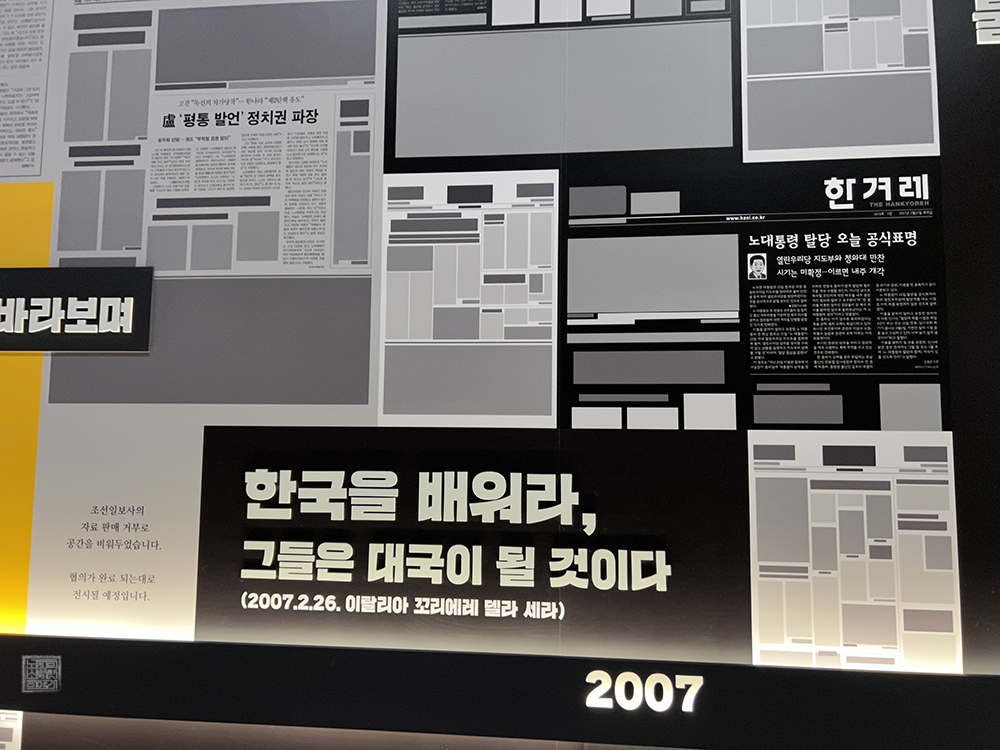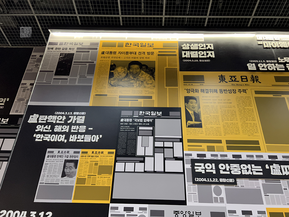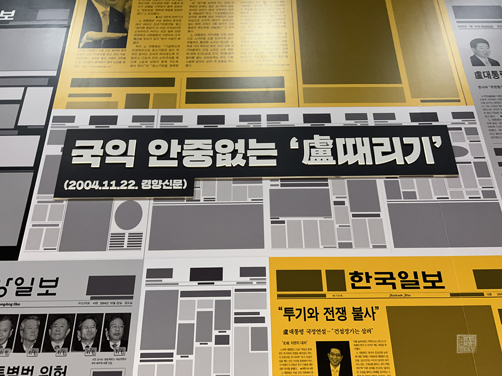 다음 전시실을 본다면 고 노무현 전 대통령이 언론과 싸웠던 그 시간이 기록된 전시물들을 볼 수 있다. 아마 고 노무현 전 대통령과 언론의 갈등은 당시 대통령으로서 볼 수 없는 수준까지 이르렀다는 것을 많은 사람이 기억하고 있을 것이다. 조중동을 비롯한 보수 언론은 임기 동안이 아니라 퇴임한 이후에도 지독하게 고 노무현 전 대통령을 괴롭혔다.
