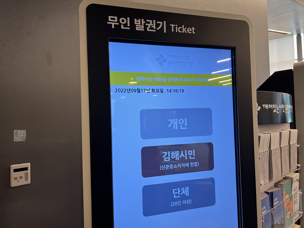 깨어있는 시민 문화 체험 전시관의 무료가 아니라 유료이기 때문에 일정 금액의 관람료를 지불해야 한다. 체험관 내부로 들어간다면 무인 발권기를 통해 개인, 김해시민(신분증 소지자에 한함), 단체 중 하나를 선택해서 관람료 지불을 할 수 있는데, 김해 시민이라면 관람료 50% 할인을 받을 수 있으니 꼭 신분증을 지참해서 찾을 수 있도록 하자.