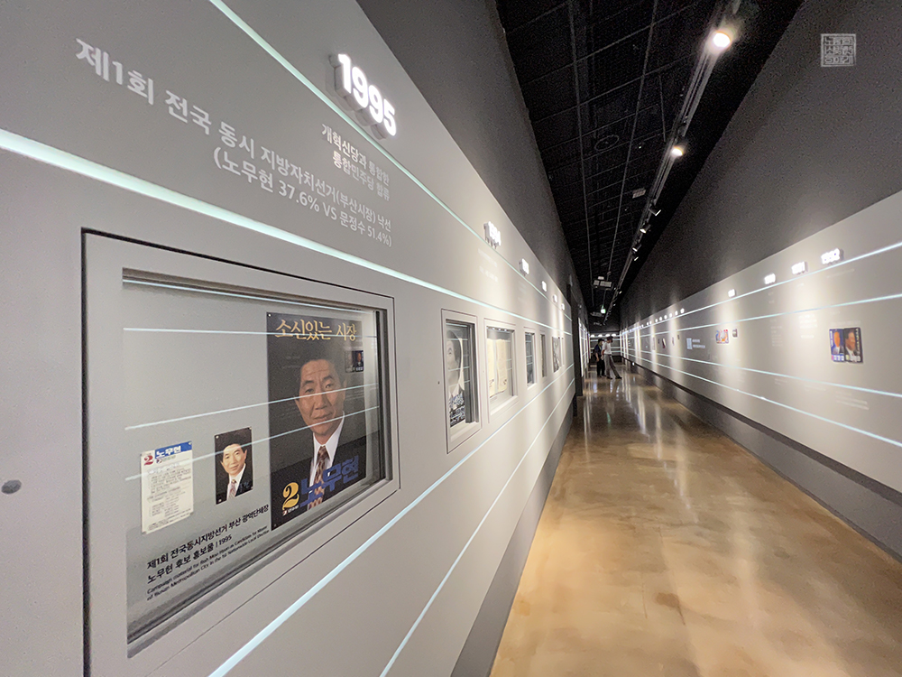 왼쪽 벽면에서는 연도에 따른 중요한 역사적 사건들이 정리되어 있고, 오른쪽 벽면에서는 고 노무현 전 대통령의 역사가 기록되어 있다. 그리고 오른쪽 벽을 따라 도표를 보다 보면 중간중간에 다양한 전시실을 마주하게 되는데, 그곳에서는 고 노무현 전 대통령과 관련된 중요한 사건의 내용이 정리되어 있거나 기록물이 따로 정리되어 있었다.