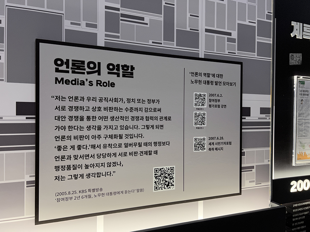 다음 전시실을 본다면 고 노무현 전 대통령이 언론과 싸웠던 그 시간이 기록된 전시물들을 볼 수 있다. 아마 고 노무현 전 대통령과 언론의 갈등은 당시 대통령으로서 볼 수 없는 수준까지 이르렀다는 것을 많은 사람이 기억하고 있을 것이다. 조중동을 비롯한 보수 언론은 임기 동안이 아니라 퇴임한 이후에도 지독하게 고 노무현 전 대통령을 괴롭혔다.