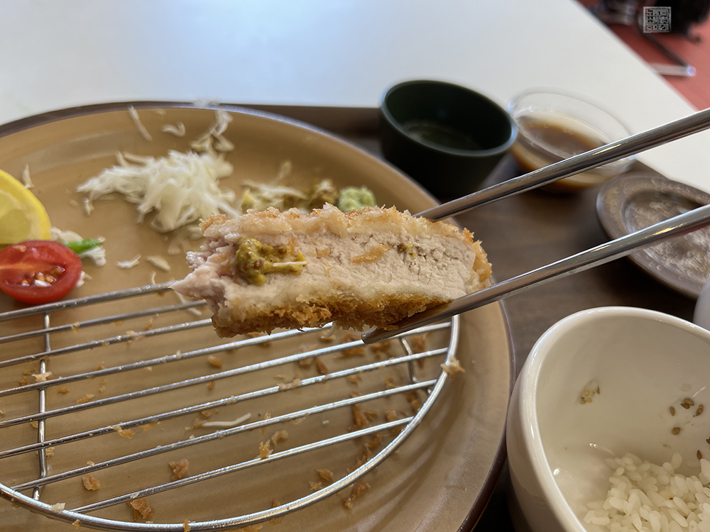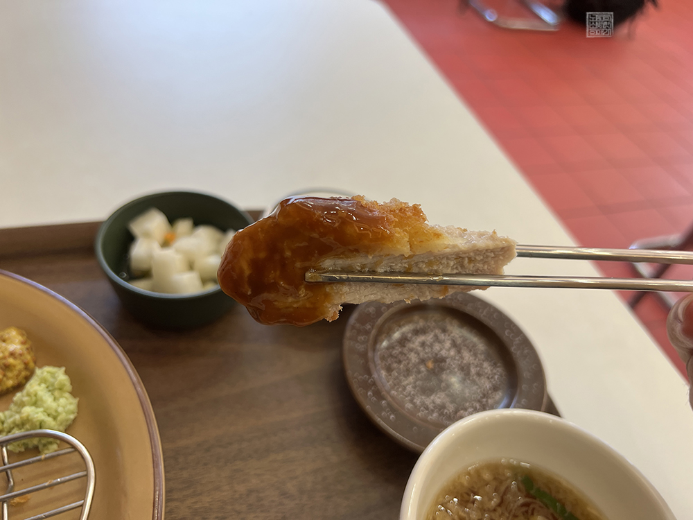 특등심카츠는 사진에서 볼 수 있듯이 먹음직스러운 모습으로 다섯 개의 조각으로 제공된다. 하지만 가게에서는 돈가스를 자를 수 있는 도구인 포크와 나이프를 제공하고 있지 않고 있는데, 평소 돈가스를 작게 잘라서 먹는 것을 좋아하거나 돈가스를 먹을 때 포크와 나이프를 이용해서 자르는 즐거움을 추구하는 사람들은 다소 아쉬울 수도 있다