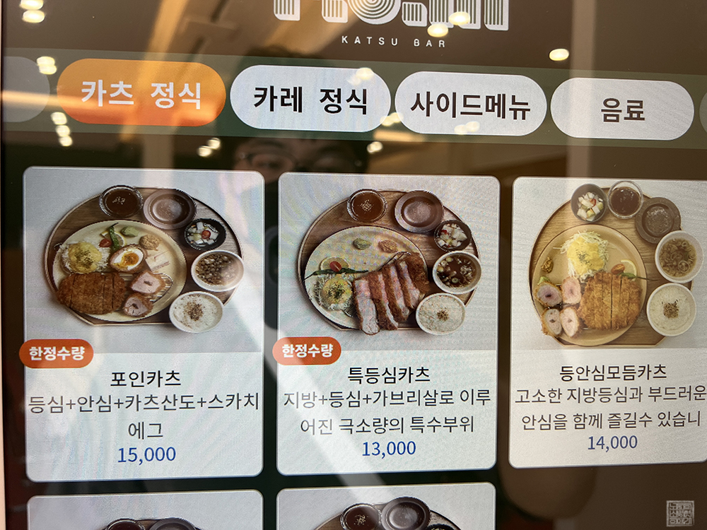 메뉴가 나누어져 있기는 하지만 그냥 특등심카츠, 등심카츠, 안심카츠 세 개의 메뉴를 중심으로 해서 돈가스를 중심으로 먹는 세트와 카레를 곁들여 먹는 세트라고 생각하면 구분이 쉽다. 가게는 메뉴판이 따로 있지 않아 포스기를 통해 메뉴를 하나씩 사진을 찍다 보니 영 보기 싫은 내 모습이 사진에 함께 비친 것이 살짝 아쉽다.