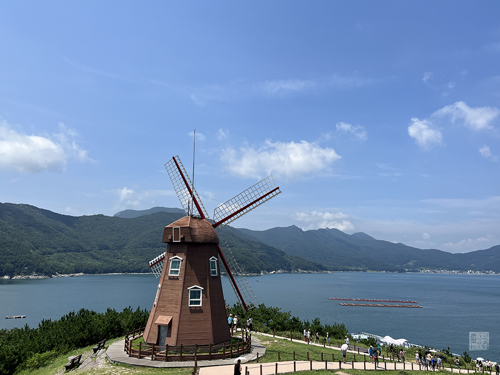 거제도 바람의 언덕의 상징 중 하나는 바로 위 사진에서 볼 수 있는 풍차다. 이 풍차는 도장포 마을 주차장에서 올라온다면 정면에서 곧바로 모습을 볼 수 있어 사진을 찍기가 편리하지만, 도장포에서 내려오는 형태로 바람의 언덕을 온다면 풍차의 후면을 바라보는 형태로 길이 있기 때문에 처음부터 정면을 배경으로 사진을 찍을 수가 없다.