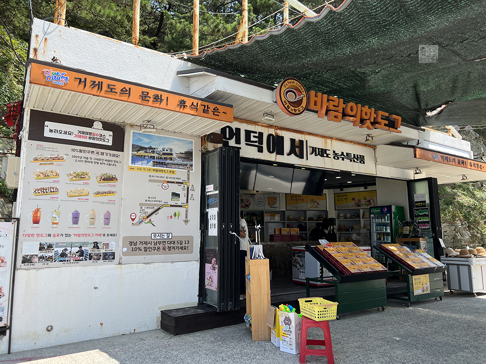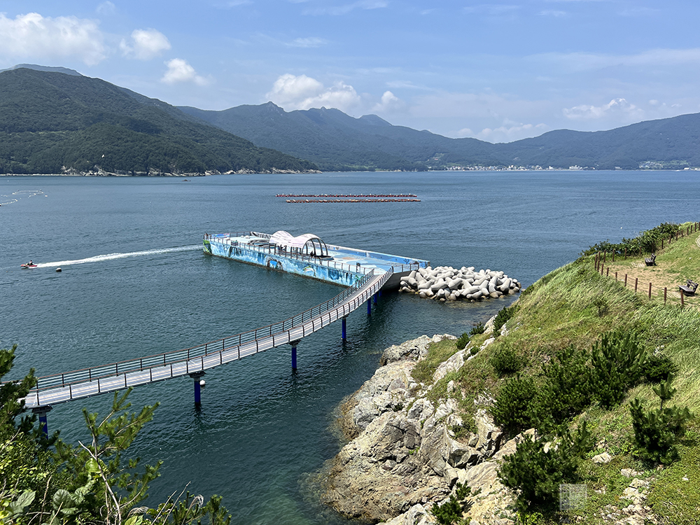 그리고 거제도 바람의 언덕에서 넓게 펼쳐진 바다를 보는 동시에 항구 마을 도장포 마을을 바라보면 바다 쪽을 향해 다리가 놓인 곳을 볼 수 있다. 이곳은 해안가에 모래가 있는 게 아니라 마을이 자리를 잡고 있다 보니 바다를 바로 앞에서 볼 수 없다는 단점이 있는데, 그 단점을 보완해서 바다 쪽을 향해 작은 다리와 쉼터가 마련되어 있다.