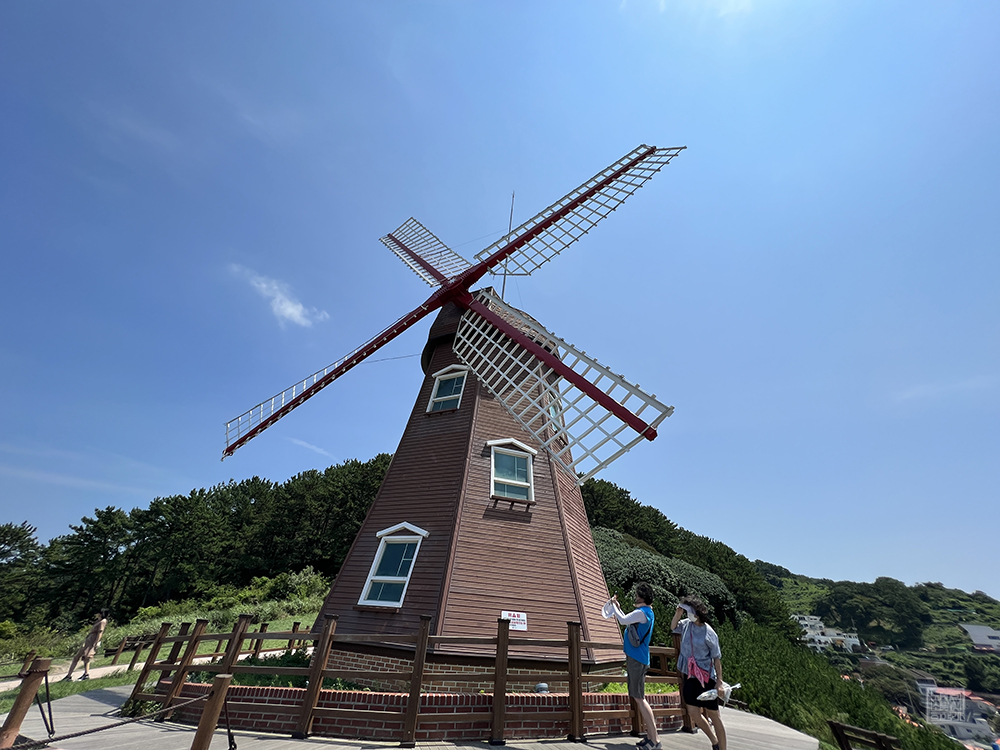 사실, 바람의 쉼터까지 걸어가더라도 막상 그곳에서 볼 수 있는 풍경은 바람의 언덕에서 내려다 보는 풍경과 큰 차이가 없어 사진을 유별나게 많이 찍지는 않았다. 바람의 쉼터에서 다시 다리를 건너 도장포 마을로 가는 길에 바람의 언덕에 놓인 풍차가 보여 각을 잘 조절하면 좋은 사진을 건질 수도 있지만, 여긴 직접 눈으로 보는 것이 훨씬 좋았다.