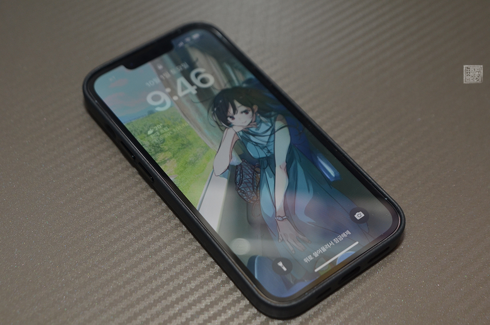 그래서 한번 지금 사용하고 있는 아이폰 13 프로 기종을 아이폰 14 프로 가죽 케이스에 끼워보기로 했다. 그랬더니 아래 사진에서 볼 수 있는 것처럼 전면을 보았을 때는 사실 아이폰 13 프로 가죽 케이스라고 말해도 전혀 위화감이 없었고, 전면 모습을 보았을 때는 노치 디자인을 제외한다면 아이폰 14 프로라고 말해도 믿을 듯해 보였다.