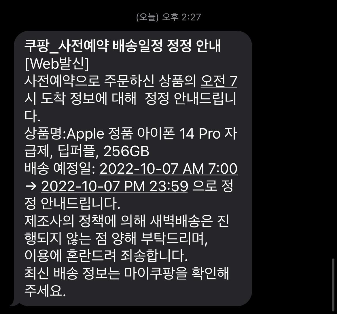 오늘 10월 7일은 아이폰 14 시리즈의 국내 정식 출시일이다. 지난 9월 30일부터 시작한 쿠팡 사전 예약을 한 사람들은 원래 오는 10월 7일(금)을 맞아 주문한 아이폰 14 시리즈를 받아볼 수 있을 예정이었지만, 오늘 아침 쿠팡에서 작은 문제가 생겼는지 주문한 아이폰 14 프로가 오늘이 아니라 내일(8일)을 맞아 도착할 예정이라는 문자를 받았다.