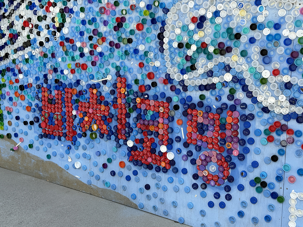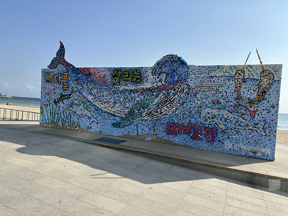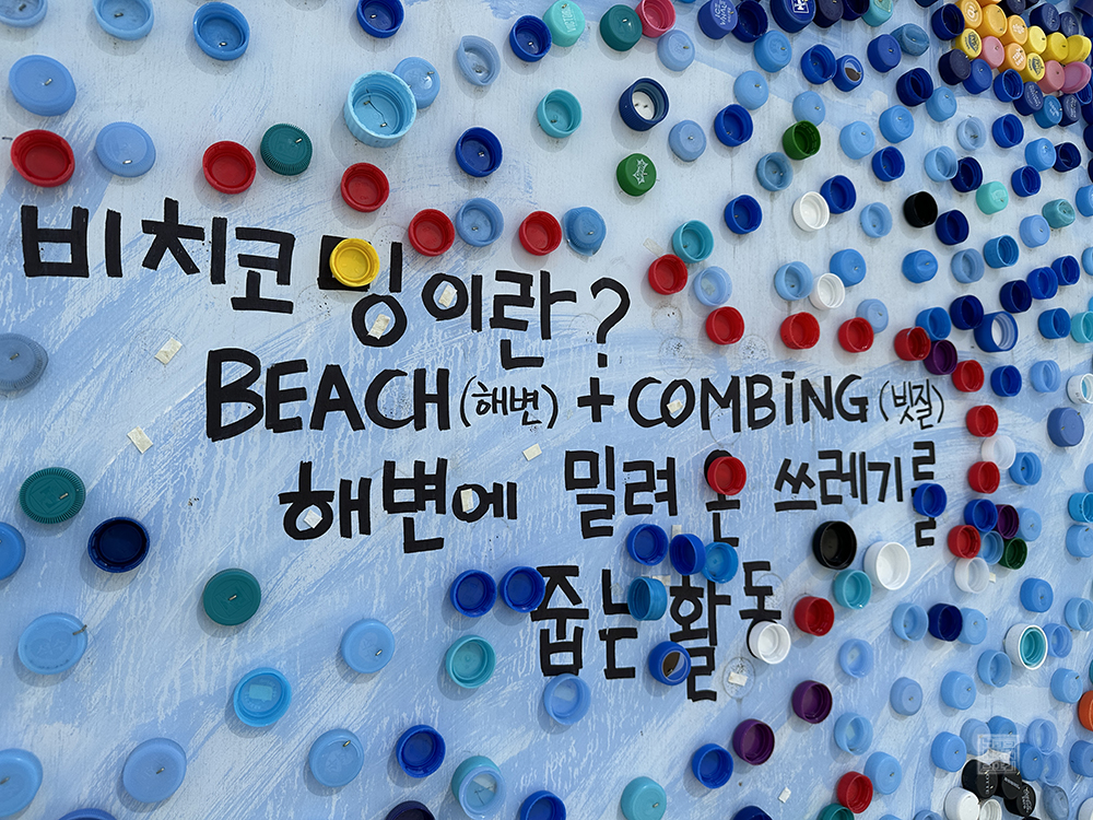 해당 장식물은 '비치코밍'이라는 기법을 활용해 디자인이 되어 있는 장식물이었다. '비치코밍'은 해변에 밀려온 쓰레기를 줍는 활동(Beach 해변 + Combing 빗질)을 뜻하는 말로, 오늘날 우리가 많이 사용하고 버리는 페트병의 뚜껑을 활용해서 고래를 중심으로 바다의 모습을 그려 놓았다. 나는 처음에 드라마 <우영우>의 장식물인 줄 알았다.