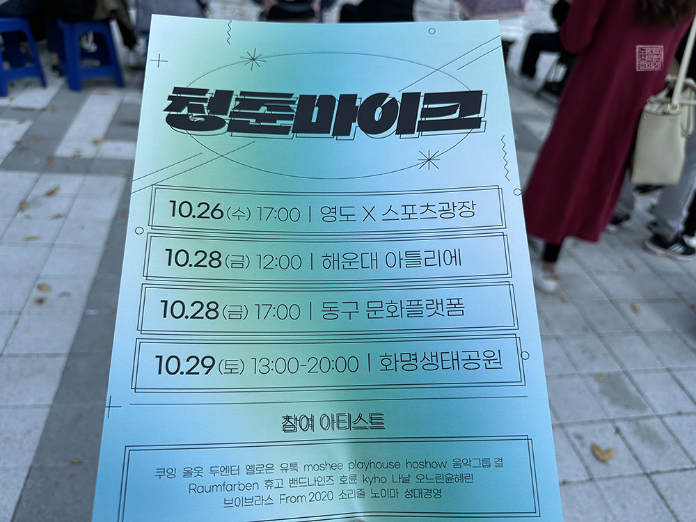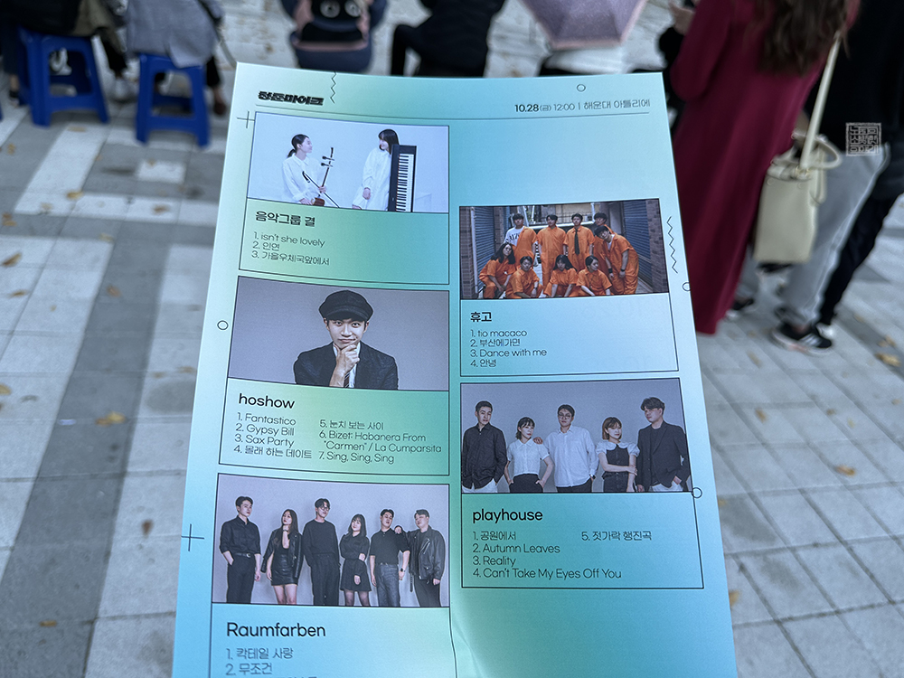 당시 현장에서 진행되는 청춘 마이크의 프로그램을 받아볼 수 있었는데, 총 다섯 팀이 해운대역 역사 문화 공원에서 공연을 선보이는 듯했다. 당시 내가 해운대역에 도착해 듣고 볼 수 있었던 공연은 아카펠라 그룹 Raumfarben 팀의 공연이었다. 당시 리더 분이 팀 이름에 대해 설명을 해주었는데 메모를 하지 않았다 보니 기억이 나지 않는다.