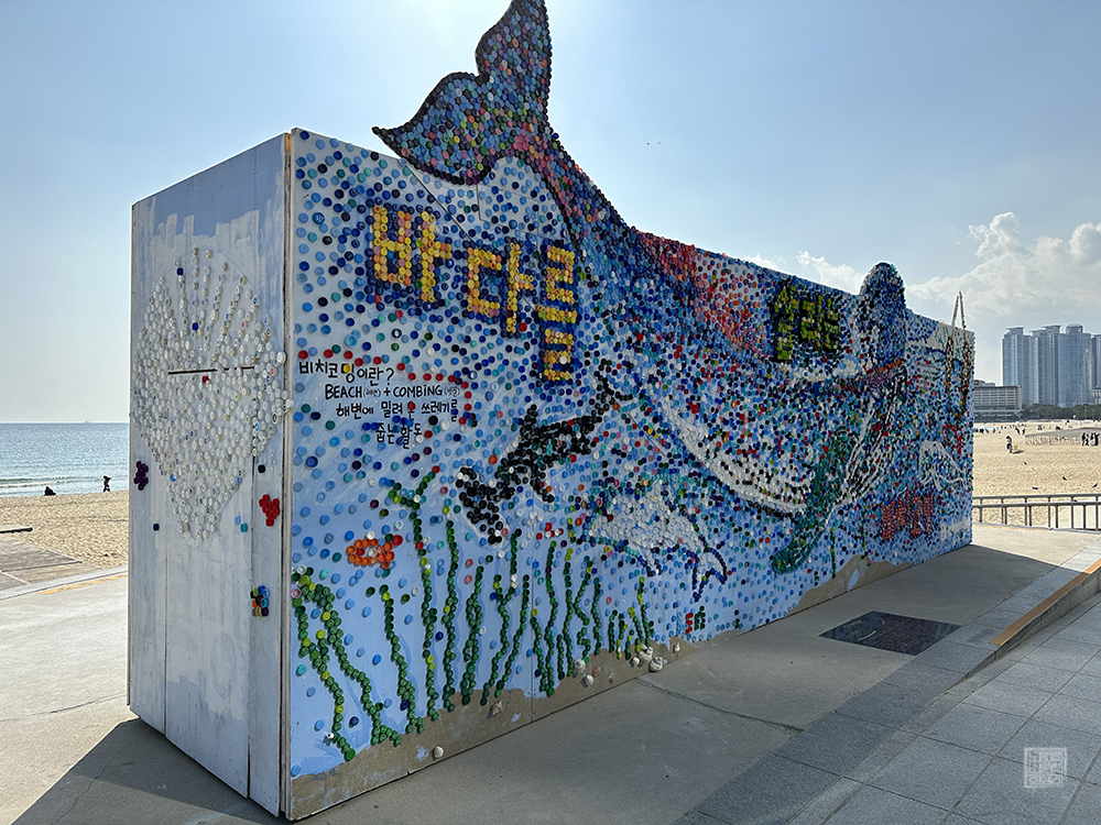 해당 장식물은 '비치코밍'이라는 기법을 활용해 디자인이 되어 있는 장식물이었다. '비치코밍'은 해변에 밀려온 쓰레기를 줍는 활동(Beach 해변 + Combing 빗질)을 뜻하는 말로, 오늘날 우리가 많이 사용하고 버리는 페트병의 뚜껑을 활용해서 고래를 중심으로 바다의 모습을 그려 놓았다. 나는 처음에 드라마 <우영우>의 장식물인 줄 알았다.