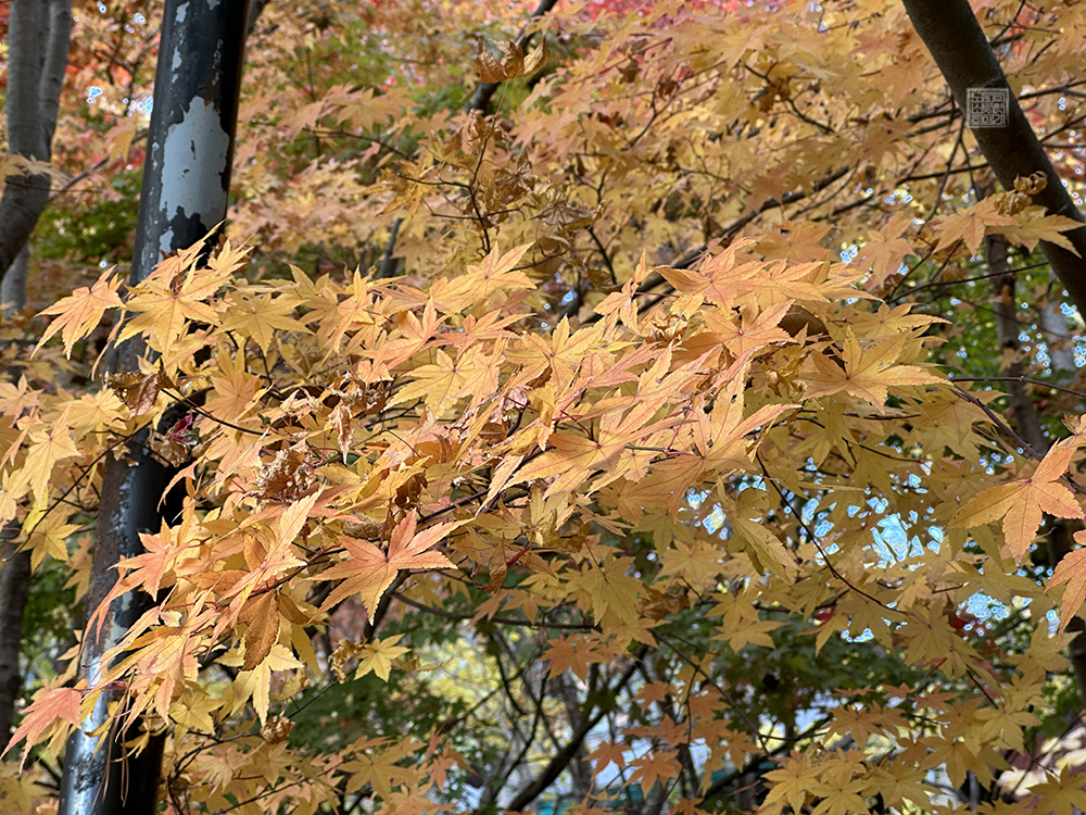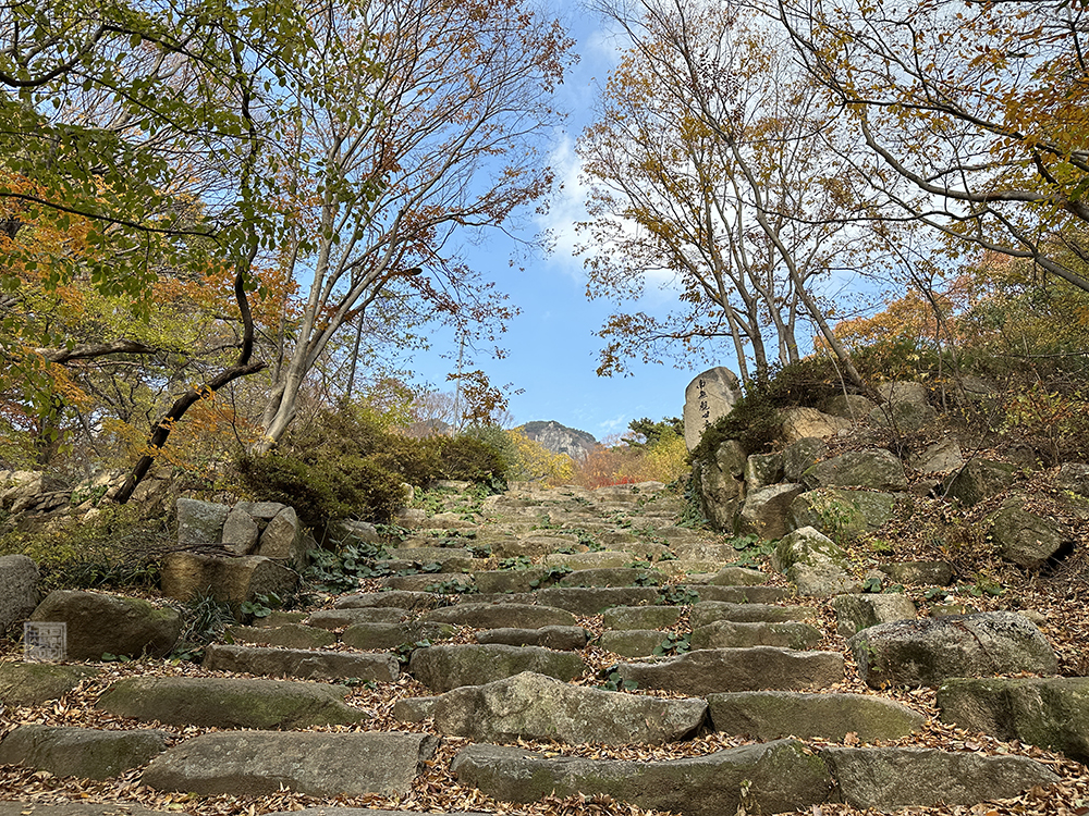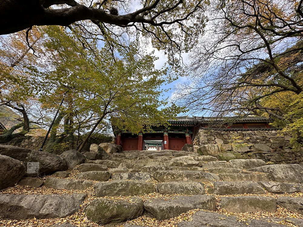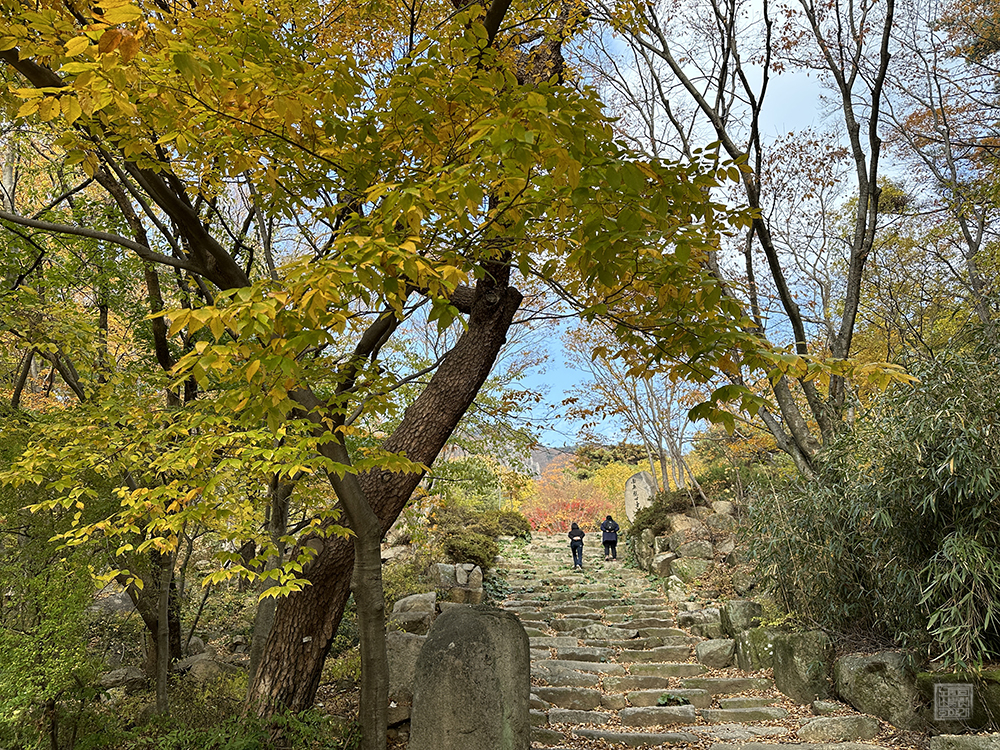 조금만 더 일찍 이곳을 찾았더라면 나뭇가지에 무수히 매달린 단풍을 배경으로 사진을 찍을 수 있었을 텐데 그렇지 못해 아쉬웠다. 하지만 11월 11일에 은하사를 찾았을 때 마주할 수 있는 풍경도 너무나 아름다웠다. 돌계단 입구를 장식하고 있는 노랗게 물이 들어가는 나무들과 사람들이 천천히 오르는 돌계단이 한 폭의 그림처럼 보였다.