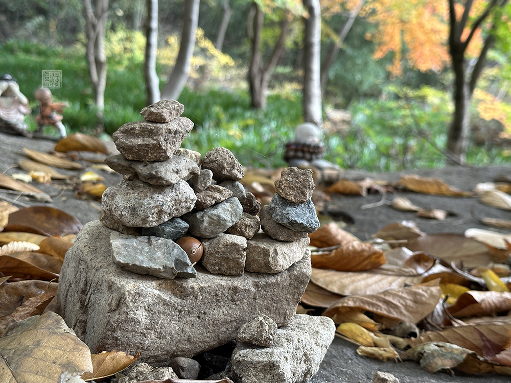 그리고 조금 더 걸어보면 이렇게 절이 있는 산길(?)에서 흔히 볼 수 있는 돌을 쌓아 작은 돌탑을 만들어 놓은 모습을 볼 수 있다. 돌탑을 피사체로 활용해서 배경을 흐리게 해서 사진을 촬영했을 때도 무척 아름다운 풍경을 사진으로 담을 수 있었다. 단풍은 눈으로 볼 때 무척 예쁜데 막상 찍으면 아쉬운 경우가 많아 이렇게 찍는 게 훨씬 나았다.