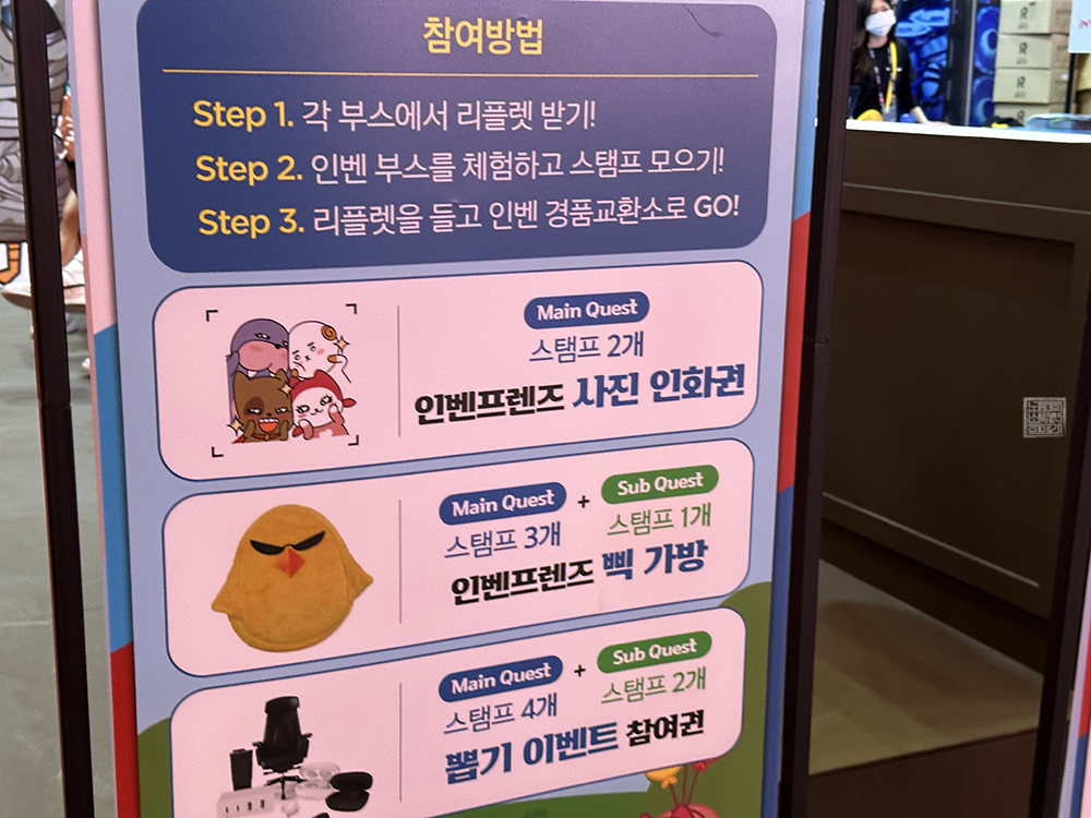 인벤 체험존은 몇 가지의 브랜드가 함께 운영하고 있기 때문에 모두 돌아보는 데에는 상당한 시간을 요구하고 있다. 스탬프 랠리는 2개부터 상품을 받을 수 있는데, 2개만 참여한 이후 상품을 받기보다 메인 퀘스트 스탬프 4개와 서브 퀘스트 스탬프 2개를 모두 모아서 뽑기 이벤트 참여권을 획득해 경품 교환소를 찾는 것이 이득이다.