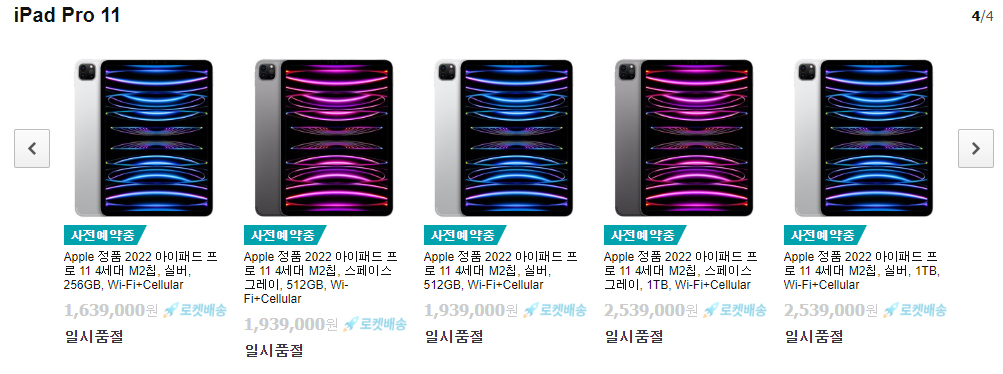 아이패드 프로를 진짜 필요로 하는 사람들은 전문적인 작업에 이용하는 경우가 많다 보니 사실 128GB 용량으로 터무니없다는 인식이 강하다. 덕분에 현재 쿠팡 사전 예약 물량을 본다면 아이패드 프로는 1TB wifi 셀룰러 모델이 가장 빠르게 품절이 되었고, 1TB가 부담스러운 사람들이 있다 보니 512GB Wifi 셀룰러 모델이 품절되었다.