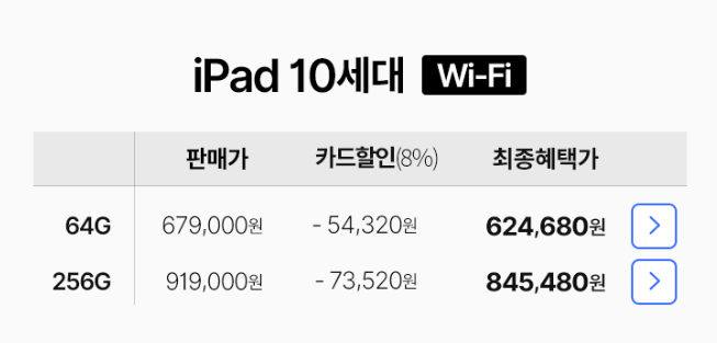 하지만 카드 할인폭이 소폭 상승한 대산 카드 할인을 받을 수 있는 카드가 다소 줄어들었다. 쿠팡에서 아이패드 10세대와 아이패드 프로 사전 예약을 할 때 카드 할인을 받을 수 있는 카드는 국민카드, 롯데카드, 우리카드, 하나카드, 농협카드 총 다섯 종류밖에 되지 않는다. 무이자 할부는 최대 22개월 지원(100만 원 이상)이 되지만 다소 아쉽다.