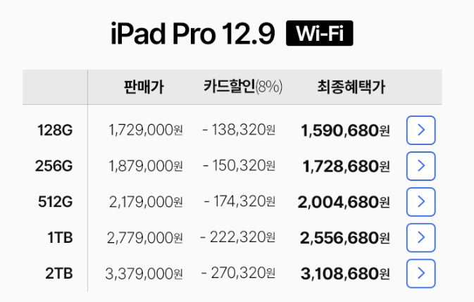 하지만 그만큼 성능이 월등히 좋아진 덕분에 아이패드 프로의 가격은 쿠팡에서 128GB를 기준으로 124만 9천 원에서 출발하고 있을 정도로 상당히 고가에 책정되어 있다. 그나마 아이패드 10세대와 비교했을 때 다행인 점은 프로 모델이기 때문에 최저 기본 용량이 128GB에서 출발한다는 점으로, 최대 2TB 모델까지 이번에 출시되었다.