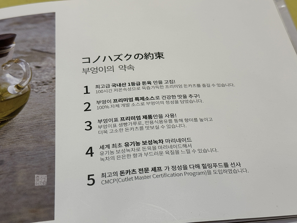 부엉이 돈카츠는 돈가스 소스를 깨를 갈아서 함께 찍어 먹을 수도 있고, 돈가스가 담긴 그릇에 고추냉이와 녹차 소금, 겨자가 함께 놓여 있어 취향에 따라 다르게 돈가스를 먹을 수 있었다. 그리고 돈가스도 등심으로 주문한 덕분에 평소 로스가스를 좋아하는 사람이라면 무조건 맛있게 먹을 수밖에 없는 겉바속촉이 제대로 갖추어져 있었다.