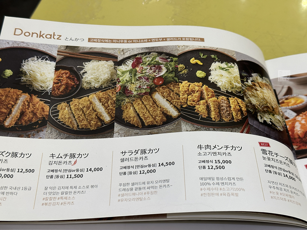 부엉이 돈가스는 모든 메뉴가 '고베 정식'과 '단품'으로 이루어져 있는데, 고베 정식을 선택한다면 미니 우동 또는 미니 소바 둘 중 하나를 선택해서 연두부와 샐러드 메뉴와 함께 받아볼 수 있다. 그냥 단품을 먹어도 되겠지만 나는 고베의 맛을 제대로 느껴보고 싶어 부엉이 돈카츠 정식을, 어머니는 김치우동 단품으로 메뉴를 주문했다.