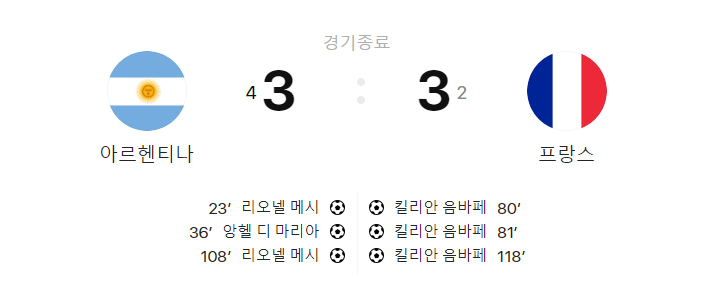 정규 시합 시간이 끝난 이후 연장전에 접어든 아르헨티나와 프랑스 두 팀은 마지막까지 볼에 대한 집중력을 발휘하며 후반 3분 메시가 3:2로 역전에 성공하며 환호성을 질렀다. 하지만 이에 질세라 한사코 아르헨티나를 압박한 프랑스는 추가로 얻은 페널티킥 찬스에서 음바페가 깔끔하게 골망을 가르면서 재차 3:3 동점이 되고 말았다.