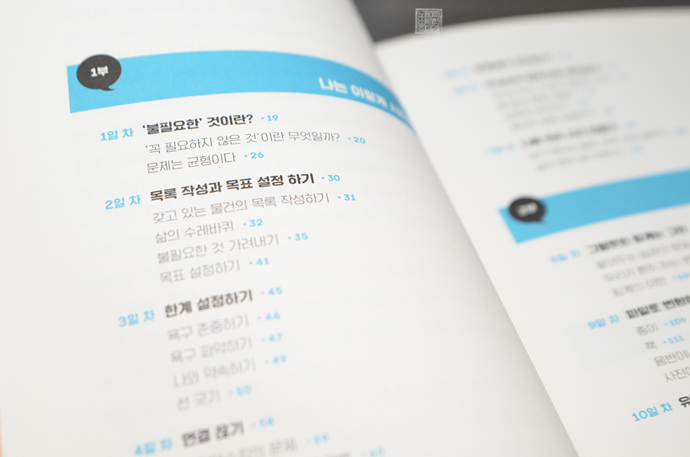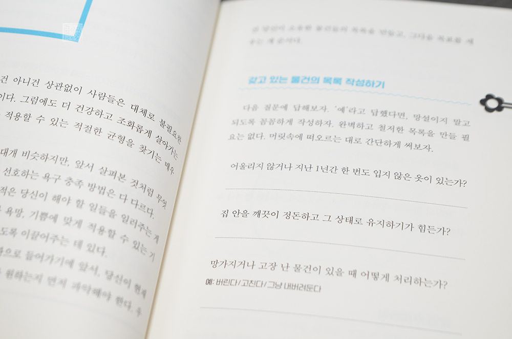 사진으로 첨부한 페이지를 본다면 '어울리지 않거나 지난 1년간 한 번도 입지 않은 옷이 있는가?', '집 안을 깨끗이 정돈하고 그 상태로 유지하기가 힘든가?'라는 질문과 함께 거기에 책을 읽는 독자가 답을 적을 수 있도록 되어 있다. 평소 정리가 되지 않는 사람들은 이러한 질문에 답을 적어 보면서 내게 필요로 하지 않는 것을 정리해볼 수 있다.