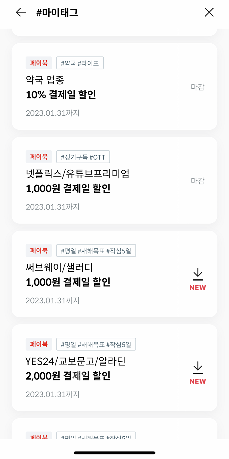 2023년 1월을 맞아 페이북 마이태그도 새롭게 갱신되어 다양한 할인 혜택을 재차 받을 수 있게 되었다. 문제는 페이북 마이태그에서 제공하는 다양한 할인 혜택 중에서 사실 내가 사용할 수 있는 혜택이 많지 않다는 게 아쉬운 점인데, 대체로 많은 사람이 사용하는 '넷플릭스/유튜브프리미엄 1,000원 결제일 할인'은 일찌감치 마감이 되었다.