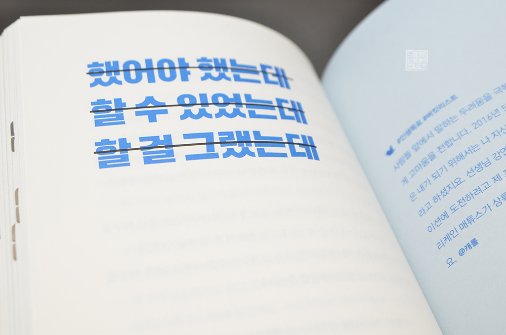 그 사람들의 차이점은 바로 용기의 유무였다. 옛말에 용기 있는 사람이 미녀를 얻는다는 말이 있듯이, 우리가 마음에 품을 수 있는 작은 용기는 늘 우리가 망설이던 일을 비로소 시작할 수 있는 유일무이한 무기가 된다. 물론, 근거 없는 자신감으로 가득 찬 용기는 때때로 오만이라는 비판을 받기도 하지만, 시작한 것과 하지 않은 건 큰 차이가 있다.