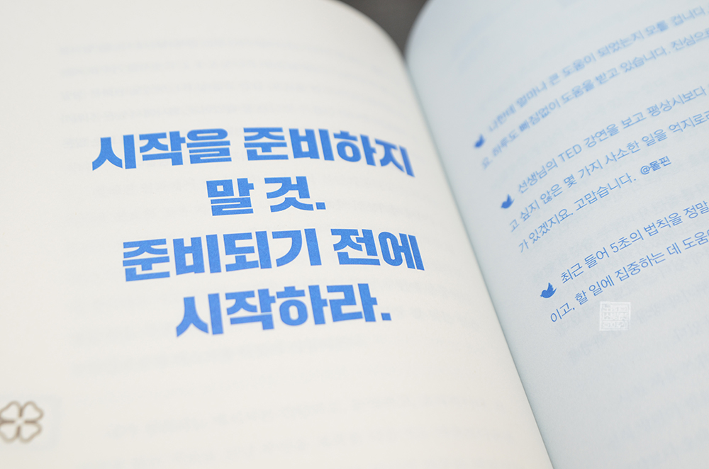 <5초의 법칙>에서 읽어볼 수 있는 저자의 이야기와 저자의 TED 강의를 듣고 변화한 사람들의 이야기는 눈앞에 놓인 '한다'와 '하지 않는다' 선택지 중 무엇을 선택하더라도 5초 안에 빠르게 결정을 내린 사람들의 이야기다. 사실 어떤 선택지에서 '하지 않는다'는 선택하는 건 나쁜 게 아니다. 문제는 그 선택을 하는 데에 소비하는 쓸모없는 시간이다.