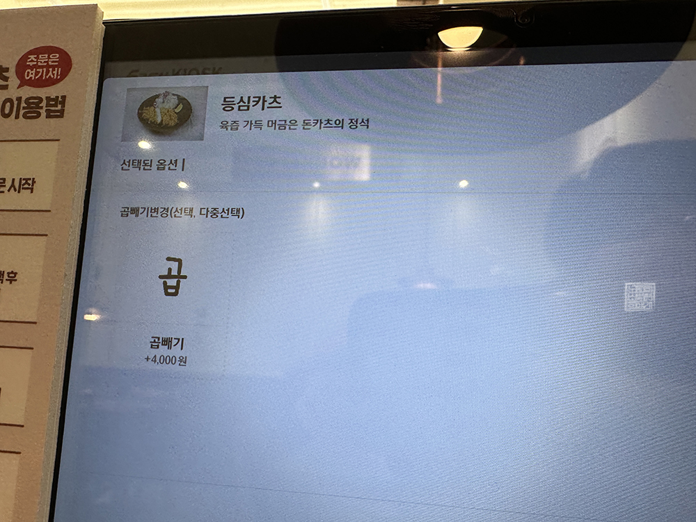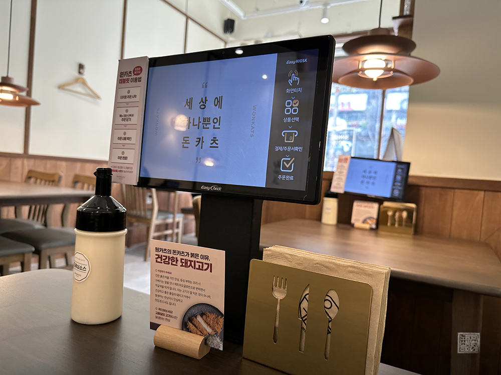 최근에는 종이 메뉴판을 이용하는 것보다 키오스크 기기처럼 앉은 테이블에서 곧바로 주문할 수 있도록 되어 있는 가게가 많다. 어떤 가게는 이러한 기기를 통해 주문할 때 곧바로 카드를 꽂아서 계산할 수 있도록 되어 있는 곳도 있는데, 원카츠 김해 내외점은 어디까지 주문만 가능하고 계산은 차후 계산대에서 따로 해야만 했다.