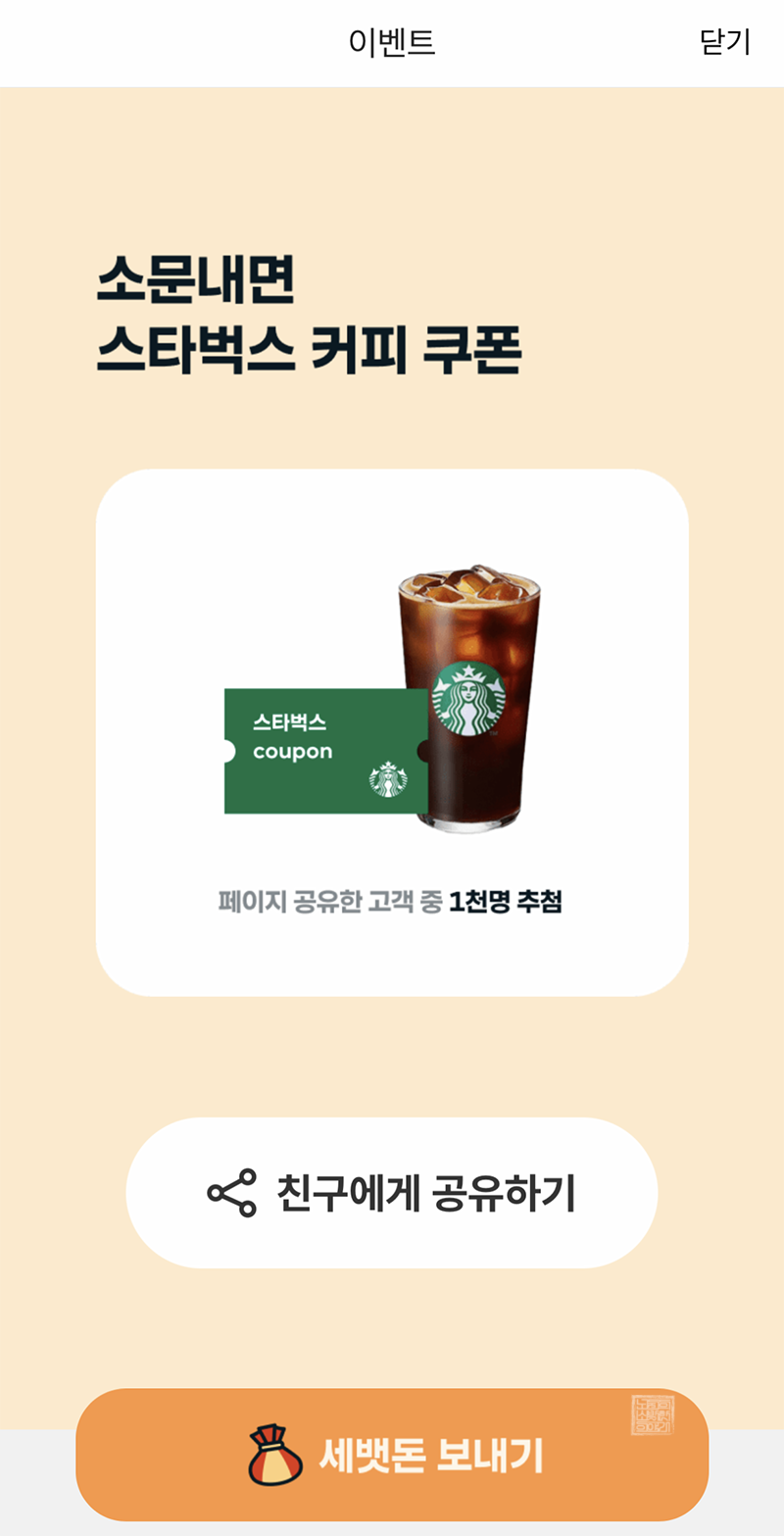 해당 이벤트를 친구에게 공유한다면 1천 명을 추첨해 스타벅스 아메리카노 쿠폰을 준다고 하니 세뱃돈을 보내는 것만 아니라 이벤트 페이지 공유도 꼭 진행할 수 있도록 하자. 페이지 공유하기 이벤트 당첨자에게는 '스타벅스 아메리카노 T 모바일 교환권'을 1월 30일(월)부터 순차 발송한다고 한다. 스벅 아메리카노 쿠폰도 꽤 괜찮다.