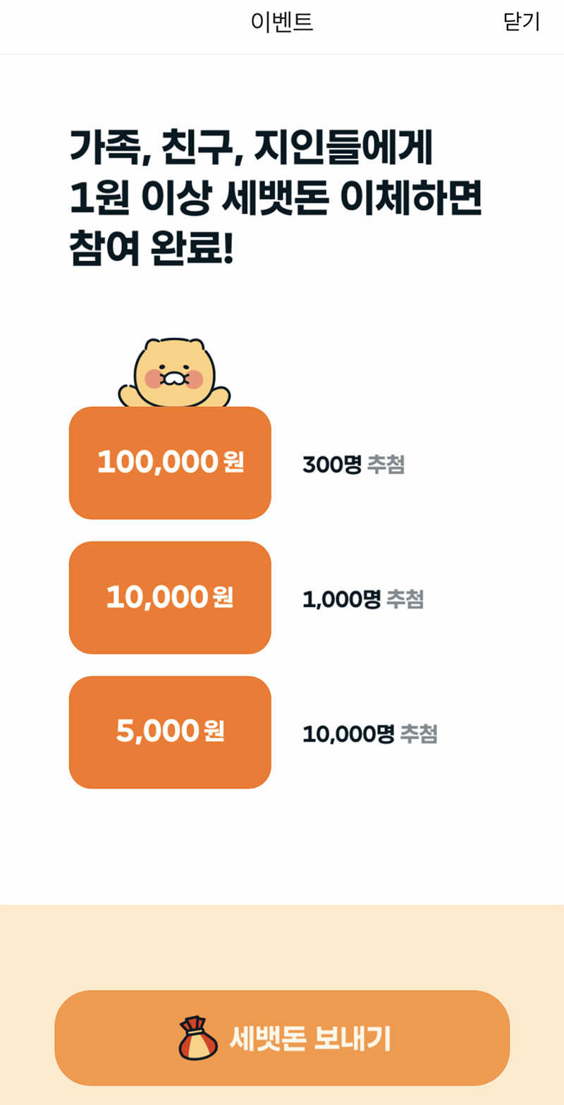 현재 카카오뱅크에서 진행하고 있는 세뱃돈 보내기 이벤트는 가족, 친구, 지인들에게 1원 이상 세뱃돈을 이체하면 추첨을 통해 최대 10만 원을 받을 수 있는 이벤트다. 1원만 보내도 이벤트에 참여가 가능해서 카카오톡 친구로 추가되어 있는 주변 지인들에게 10원 혹은 100원의 세뱃돈을 보내고 후에 운이 좋으면 10만 원을 벌 수도 있다.