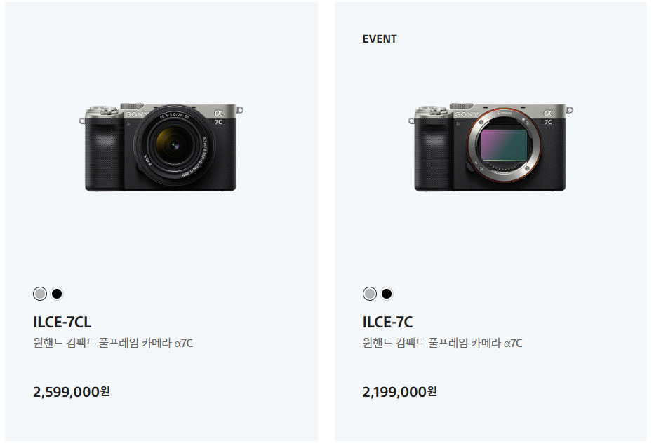 위 사진을 본다면 소니 풀프레임 미러리스 카메라 a7c 제품 시리즈의 가격을 비교한다면 쿠팡에서 판매하는 게 훨씬 저렴하다는 것을 알 수 있다. 소니 공식 스토어에서는 표준줌 렌즈 패키지(ILCE-7CL)가 약 259만 원이지만, 쿠팡에서는 약 235만 원에 판매되고 있다. 바디 단품의 가격도 쿠팡이 약 20만 원 정도 더 저렴하게 책정되어 있다.