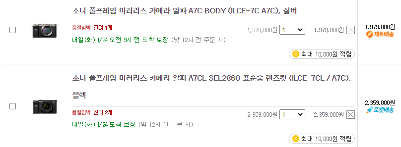이건 쿠팡만 아니라 소니 스토어도 같았다. 소니 스토어에서도 항상 '일시품절'이라는 문구가 함께 붙어 있었는데, 지난해 4분기부터 물량이 풀리기 시작했는지 소니 스토어에서는 금방 재고가 채워지는 것을 확인할 수 있었다. 그리고 나는 어제 어쩌다 보니 오랜만에 쿠팡에서 a7c를 검색해 보았더니 쿠팡에서도 다시금 재고가 채워져 있었다.