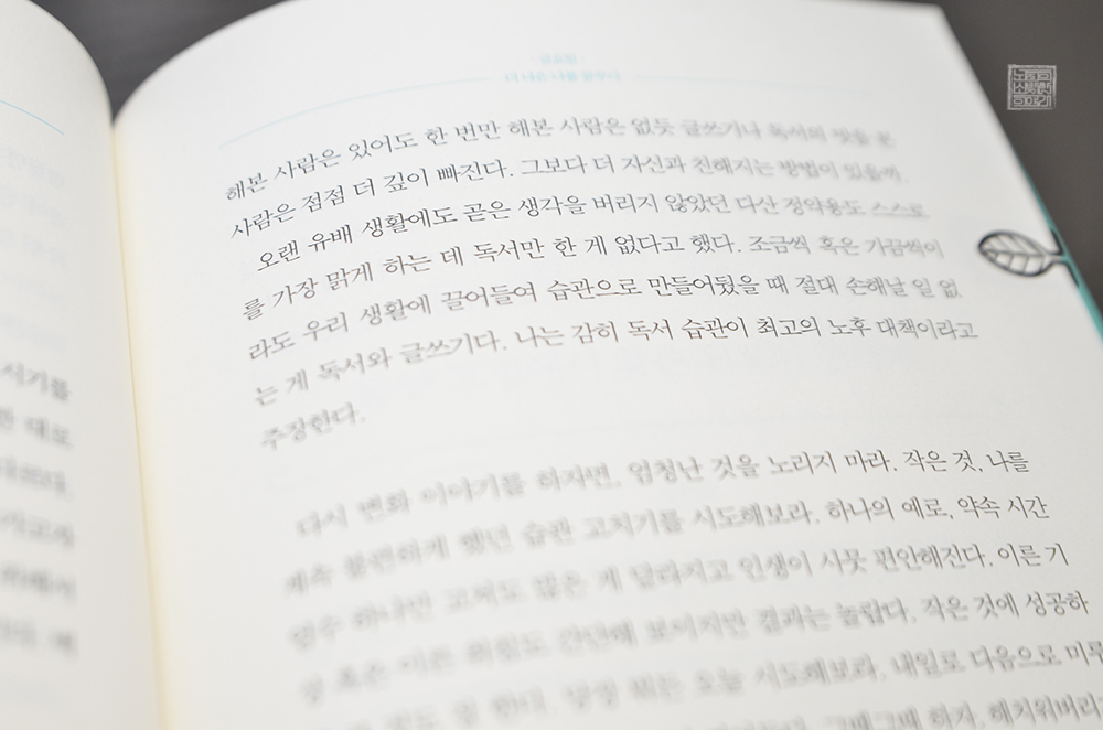 오랜 유배 생활에도 곧은 생각을 버리지 않았던 다산 정약용도 스스로를 가장 맑게 하는 데 독서만 한 게 없다고 했다. 조금씩 혹은 가끔씩이라도 우리 생활에 끌어들여 습관으로 만들어뒀을 때 절대 손해 날 일 없는 게 독서와 글쓰기다. 나는 감히 독서 습관이 최고의 노후 대책이라고 주장한다. (본문 167)