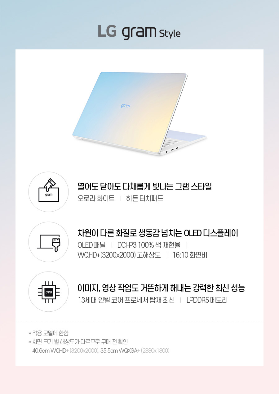 인기 아이돌 그룹 뉴진스가 CF 모델로 발탁되어 홍보 중인 LG그램 스타일. 열어도 닫아도 다채롭게 빛나는 오로라 감성을 지니고 있는 LG그램 스타일은 '스타일'이라는 수식어 그대로 하나의 패션 아이템으로 스타일을 돋보일 수 있는 노트북이고, 외관만 아니라 내부까지 LG전자가 자랑하는 뛰어난 기술이 들어가 있는 최고의 노트북이다.