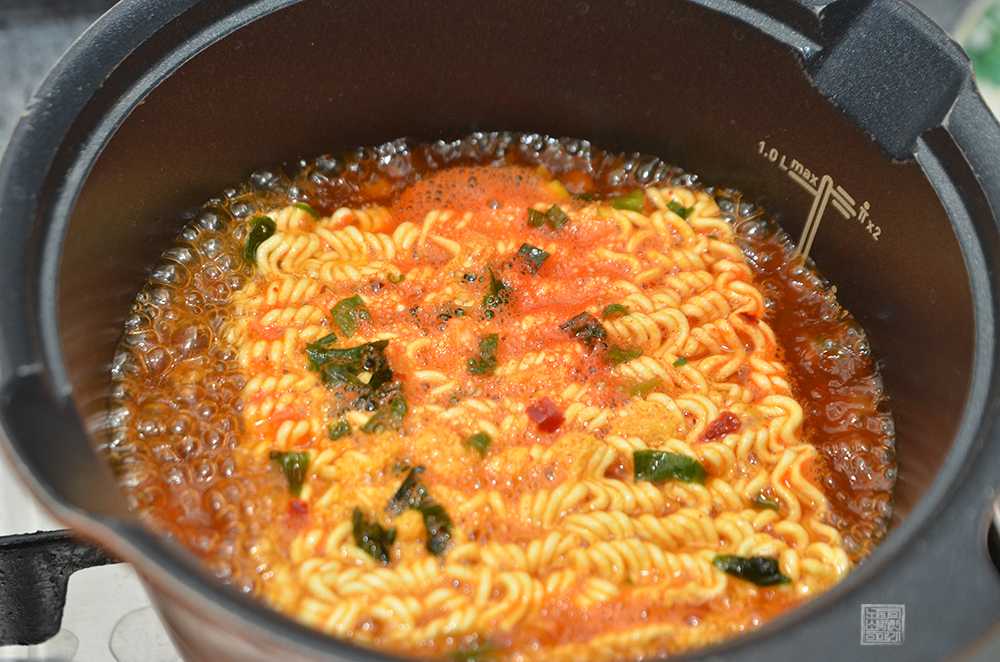 본격적으로 물이 끓기 시작했기 때문에 건더기 스프를 먼저 넣고, 분말 스프를 넣고, 라면을 순서대로 넣어보았다.
