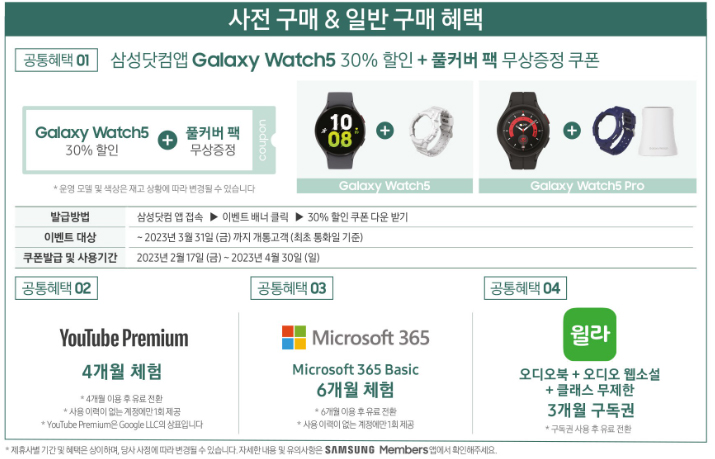 사전예약으로 받을 수 있는 다른 혜택을 확인하지 않더라도 이미 위 사진에서 볼 수 있는 두 개의 혜택만으로도 우리는 갤럭시 S23을 사전예약 구매할 이유가 충분하다. 하지만 사전예약 혜택으로 받을 수 있는 건 용량 업그레이드와 최종 판매가 할인만이 아니라 갤럭시 버즈2 프로 구매 쿠폰과 갤럭시 와치 5 30% 할인 쿠폰을 함께 받을 수 있다.