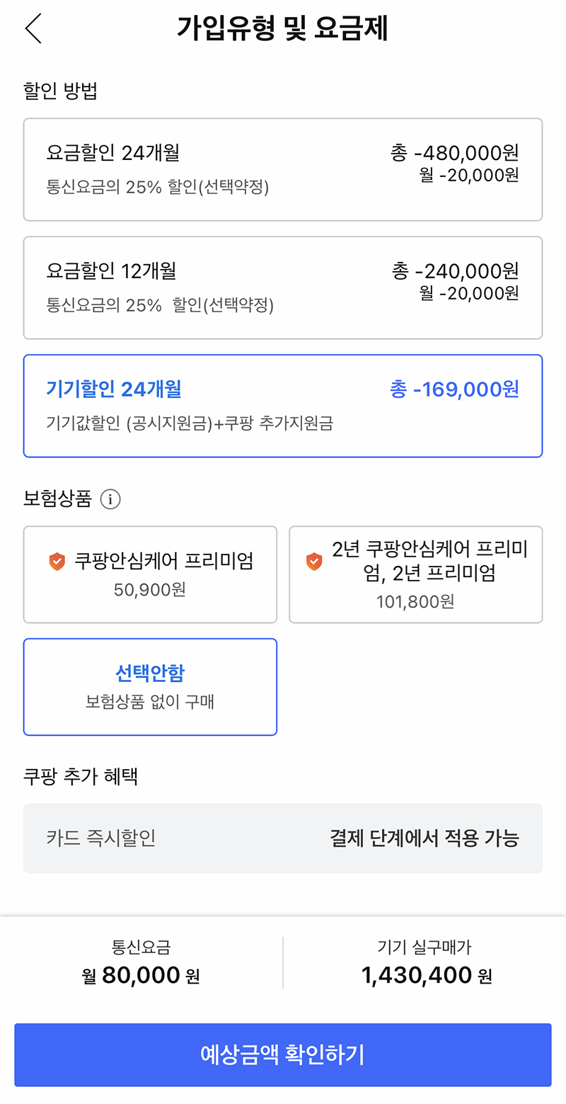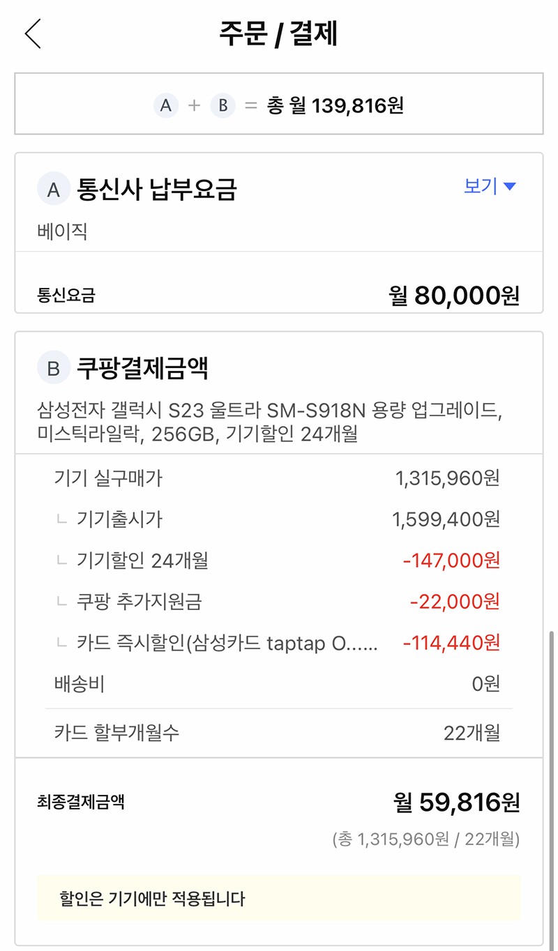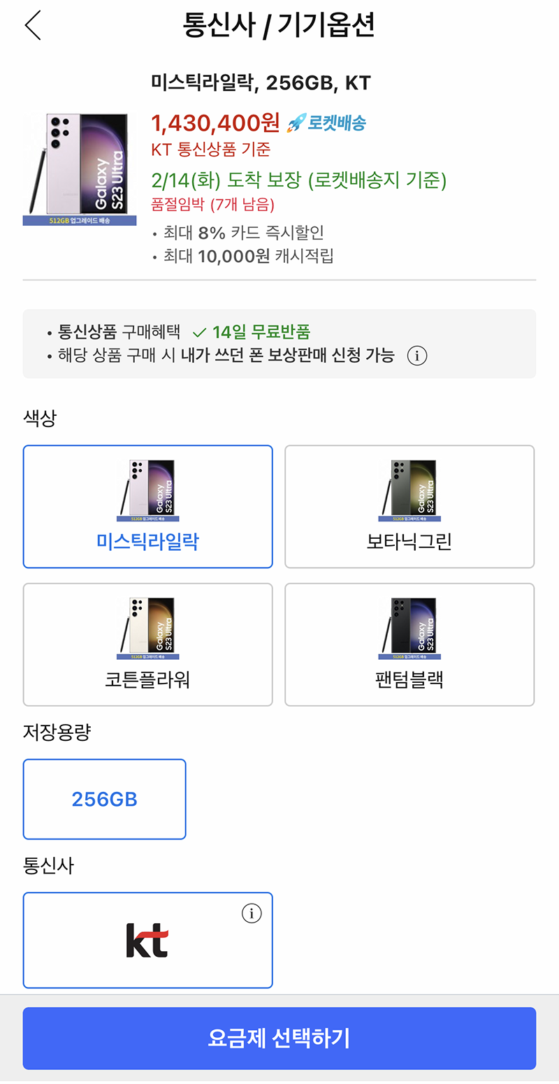 그리고 쿠팡에서 구매할 수 있는 갤럭시 S23 시리즈 사전예약은 단지 자급제 제품을 카드 즉시 할인을 받아서 구매하는 것만 아니라 통신사 약정으로도 구매할 수 있다. 쿠팡에서 구매할 수 있는 모바일 상품은 KT와 유플러스 두 개의 통신사로 제한이 되지만, 각 통신사 약정을 통해 단말기 할인 혹은 통신요금 할인 둘 중 하나를 선택할 수 있다.