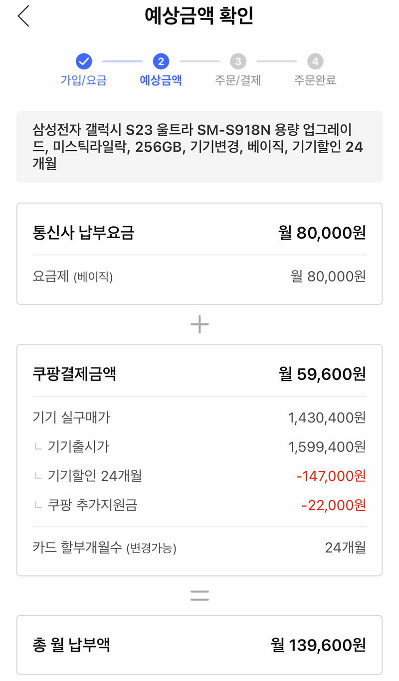 현재 쿠팡 로켓 모바일로 구매할 수 있는 KT 통신상품 기준 갤럭시 S23 모델은 약 7대의 재고만 남아 있을 정도로 자급제만큼 혹은 자급제 이상으로 많은 인기를 누리고 있는 듯하다. 그 이유는 기기할인이 아니라 요금할인 24개월을 선택한다면 최종적으로 48만 원까지 할인이 되는 셈이라 고정 지출이 오히려 더 크게 줄어들기 때문이다.