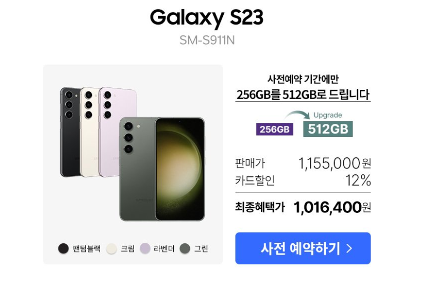 일반적으로 신형 스마트폰을 빠르게 구매하지 않는 사람들은 굳이 사전 예약을 하려고 하지 않는다. 하지만 이번에 새롭게 출시된 갤럭시 S23만큼은 사전 예약을 통해 구매하는 것이 무조건 이득이다. 그 이유 중 하나는 갤럭시 S23 시리즈를 사전예약 구매한다면, 256GB 제품을 사전예약 기간에만 512GB로 용량을 업그레이드해 주기 때문이다.