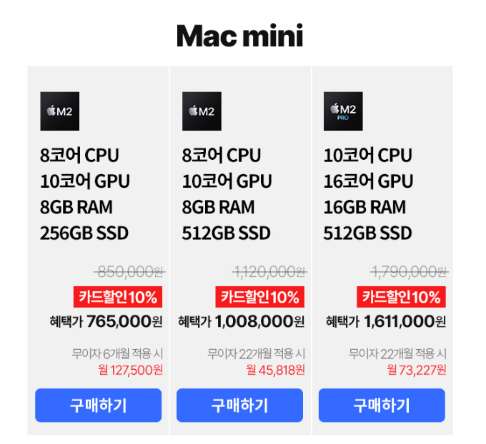 2023 맥 미니 M2 모델은 가정 저렴한 모델이 85만 원에서 출발하고 있는데, 현재 사전 예약 기간 중에만 쿠팡 와우 회원을 대상으로 제공되는 카드 즉시 할인 10%를 적용해서 혜택가 76만 5천 원에 구매할 수 있다. 100만 원 미만의 구매 금액에 한해 지원되는 무이자 할부 6개월을 적용한다면 한 달에 약 12만 7천 원이 매달 지불되는 셈이다.