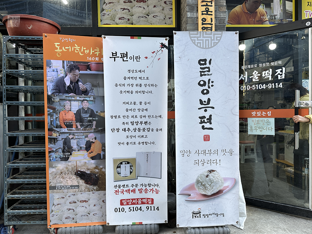 어머니와 함께 밀양을 찾아 외할머니께 가져가 드릴 몇 가지 반찬을 사기 위해서 밀양 아리랑 시장을 들렀다가 우연히 한 가게에 눈이 멈췄다. <김영철의 동네 한 바퀴>에 나왔을 뿐만 아니라 <6시 내 고향> 등 TV에 다수 방영되었다고 하는 떡집이 있었다. 어머니와 외할머니가 평소 떡을 좋아하시기에 여기서 떡을 조금 사 가면 어떨까 싶었다.