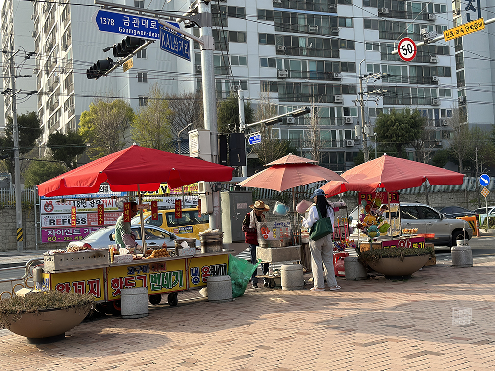 그리고 연지공원에서는 꽃놀이하면 빠질 수 없는 여러 노점의 모습도 볼 수 있었다. 공원 내에서는 노점 운영이 금지되어 있기 때문에 공원 출구마다 노점이 한 개씩 자리를 잡고 있었는데, 이런 시기에 이런 곳을 온다면 괜스레 노점에서 판매하는 핫도그 혹은 왕꼬지 같은 건 괜스레 먹고 싶어지는 것 같다. 이게 바로 꽃의 마법이라고 할까?