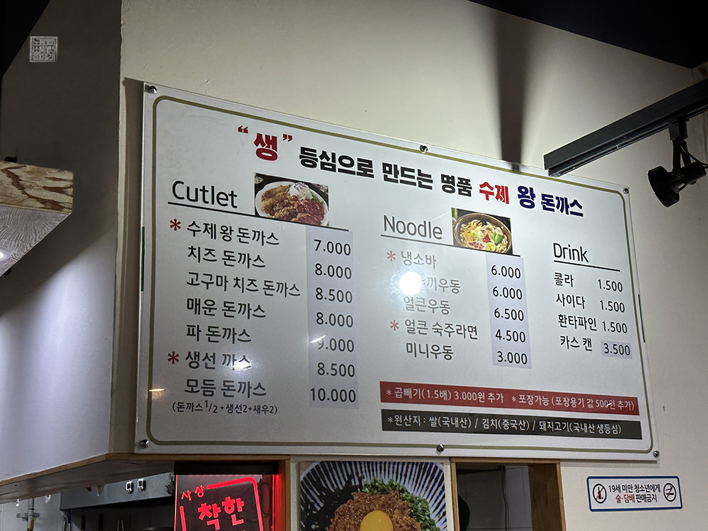 요즘 어디를 가더라도, 아니, 김밥천국을 가더라도 돈까스는 1만 원에 가까운 가격으로 책정되어 있다. 하지만 사상역 인근에 있는 명품 수제 왕돈까스에서는 여전히 수제 왕돈까스가 7천 원일 뿐만 아니라 치즈 돈까스도 8천 원에 판매되고 있었다. 유일하게 1만 원인 메뉴는 돈까스와 생선, 새우를 함께 먹을 수 있는 모든 돈까스다.