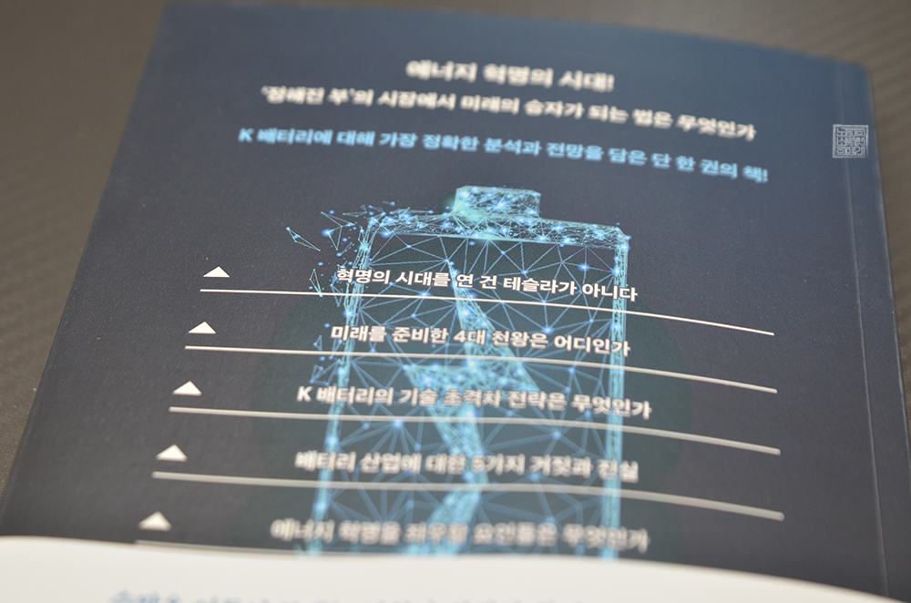그 책은 위 사진에서 볼 수 있는 <K 배터리 레볼루션>이라는 이름의 책으로, 이 책은 무조건 오를 수 있다면서 다양한 주식 종목을 소개하는 게 아니라 제목 그대로 K 배터리 산업의 미래에 대해 이야기하고 있다. 책의 저자 '박순혁'은 한국의 배터리 산업에 일찌감치 눈독을 들인 이후 K 배터리 산업의 비약적인 성장을 예고하며 투자를 호소했다.