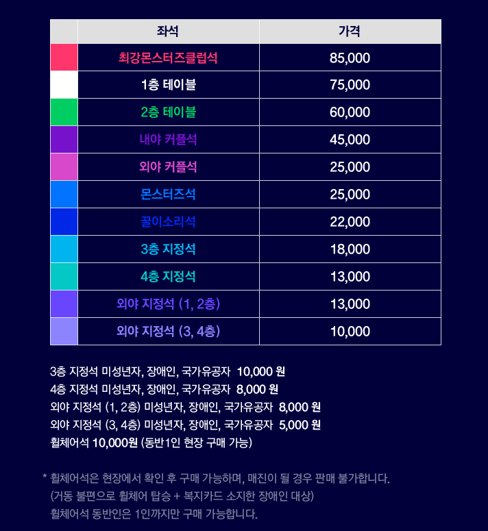 흔히 포수 뒷자리라고 말하는 최강몬스터즈클럽석을 본다면 가격이 85,000원에서 시작하고 있어 절대 저렴하지 않다는 것을 알 수 있다. 비록 방송사에서 주관하는 야구 경기라고 해도 가격이 조금 비싼 게 아닌가 싶지만, 주말에 펼쳐지는 프로야구의 티켓 가격도 비슷한 수준으로 형성되어 있기 때문에 크게 위화감은 없다고 생각한다.