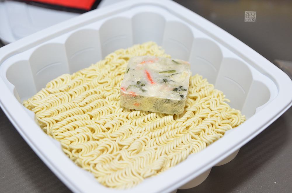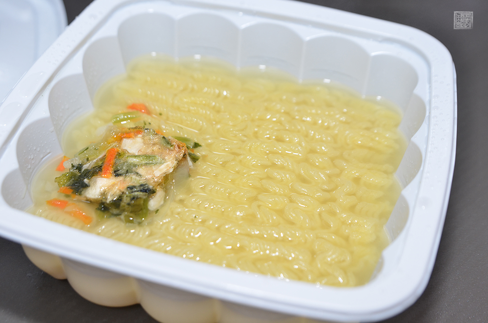 가정용 전자레인지(700W) 기준으로 3분 30초 동안 조리 후 물을 버리고 떡잎마을 방범대 야끼소바에 첨부되어 있던 소스와 후레이크를 넣고 비벼준 모습은 위 사진과 같다. 가쓰오부시를 넣지 않은 이유는 개인적으로 비린내가 확 풍기는 가쓰오부시를 좋아하지 않기 때문으로, 첨부된 가쓰오부시에 문제가 따로 있었던 것은 아니었다.